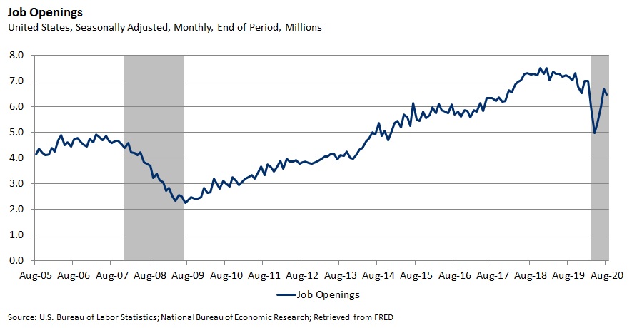 “The number of available positions slipped to 6.49 million during the month from an upwardly revised 6.7 million in July. A Bloomberg survey of economists called for a decrease to 6.5 million. Separations, which include layoffs and quits, dipped to 4.59 million in August, reflecting decreases in the number of job cuts as well as people voluntarily leaving their jobs.” – Bloomberg