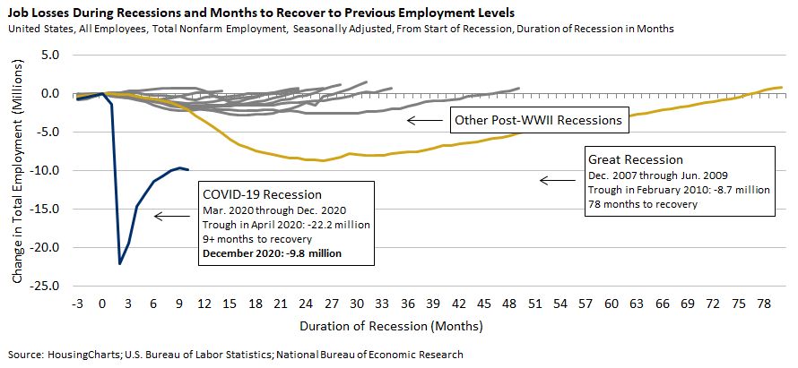 “In 2020, the economy shed a net 9.37 million jobs, exceeding the 5.05 million jobs lost in 2009, in the aftermath of the global financial crisis. Hardest hit last year were hotels, restaurants and related industries, driving up unemployment among minorities, the young and less educated workers—groups already disproportionately hit by the economic effects of the coronavirus. Unemployment among Black and Hispanic workers has significantly exceeded the national average throughout the pandemic.” – The WSJ